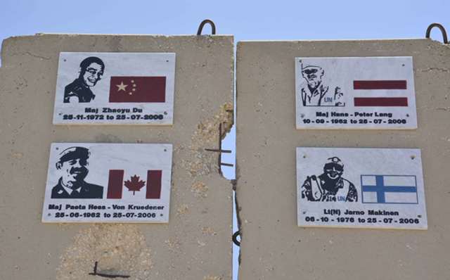 2015年清明节,我和战友去了营地十多公里外的一个纪念碑,那里原来是个观察哨。2006年,联合国停战观察组织驻黎观察团的四位观察员在该处执行任务,遭到以色列的威胁和驱赶后撤入地下掩体,随后以色列发动袭击,飞机投弹落在掩体上方,四人全部牺牲,其中包括一位中国中校。每年清明,中国维和人员都会前去祭奠。