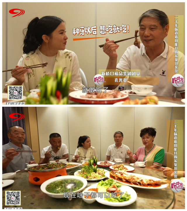 口福挑战第一关,节目组便呈上了镇店之宝——青椒兔,先煸后炸的烹饪方式将花椒的麻与青椒的香完美融合,从而营造出麻辣干香、外酥里嫩的风味与口感。只见口福品鉴团团员们嚼得轻松自在,丝毫不见曾饱受缺牙困扰的窘态。在新桥口腔种了全口牙的蒋叔叔连连赞道:“这个味道好吃!”而其好友庞叔叔曾经面对美食只能望而却步,如今种好牙也能在细细品味后点评一番:“成都的天气很适合吃麻辣,巴适!”