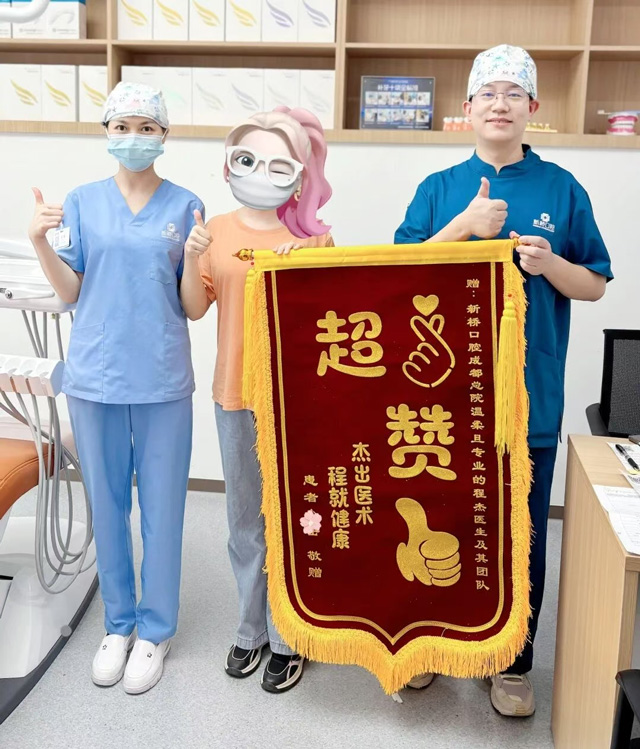 近日,新桥口腔成都总院(成都人南新桥口腔医院)种植专科程杰医生收到了一面格外吸睛的锦旗——红彤彤的缎面上,“超赞”两个大字跃然眼前,下方金色大拇指高高竖起,旁边还有一个温暖的比心手势,侧旁一行稍小的标语“程就健康,杰出医术”更是点睛之笔。